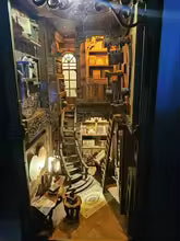 A book nook is a decorative miniature insert that fits between books on a shelf, creating the illusion of a tiny hidden world. Often inspired by libraries, fantasy alleys, or cozy reading spaces, book nooks combine model-building with interior décor.