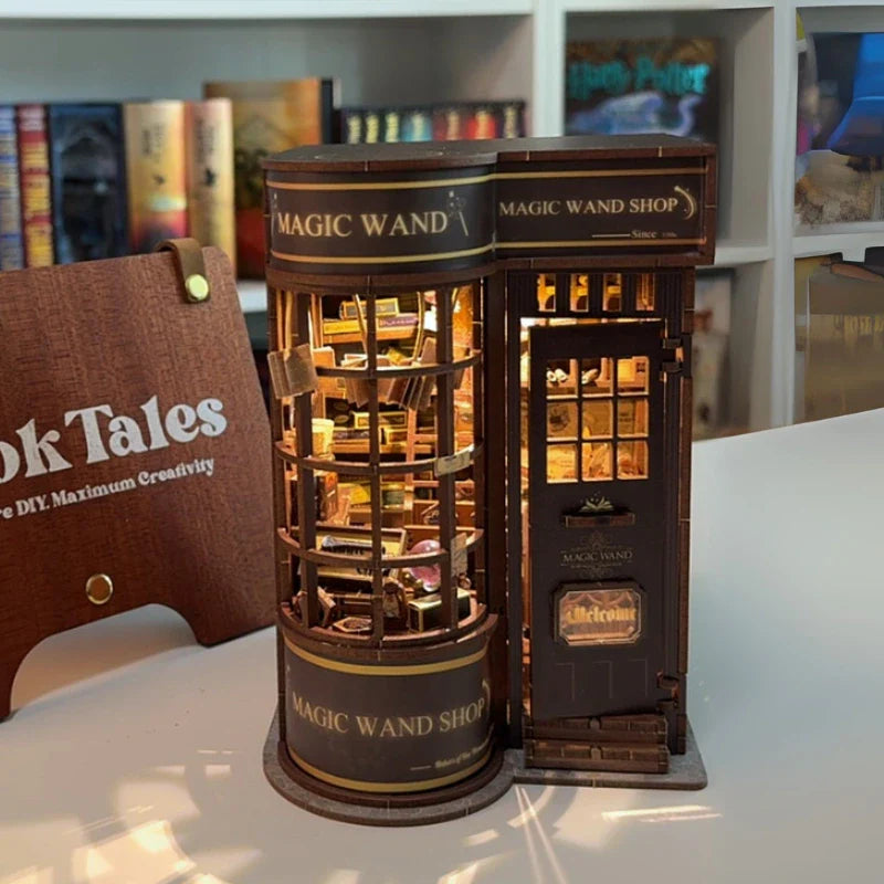 This magic wand shop book nook includes pre-cut and pre-painted wooden pieces, LED lighting system, floating scroll elements, and illustrated instructions. The finished miniature fits perfectly between books or stands alone as wizard decor.